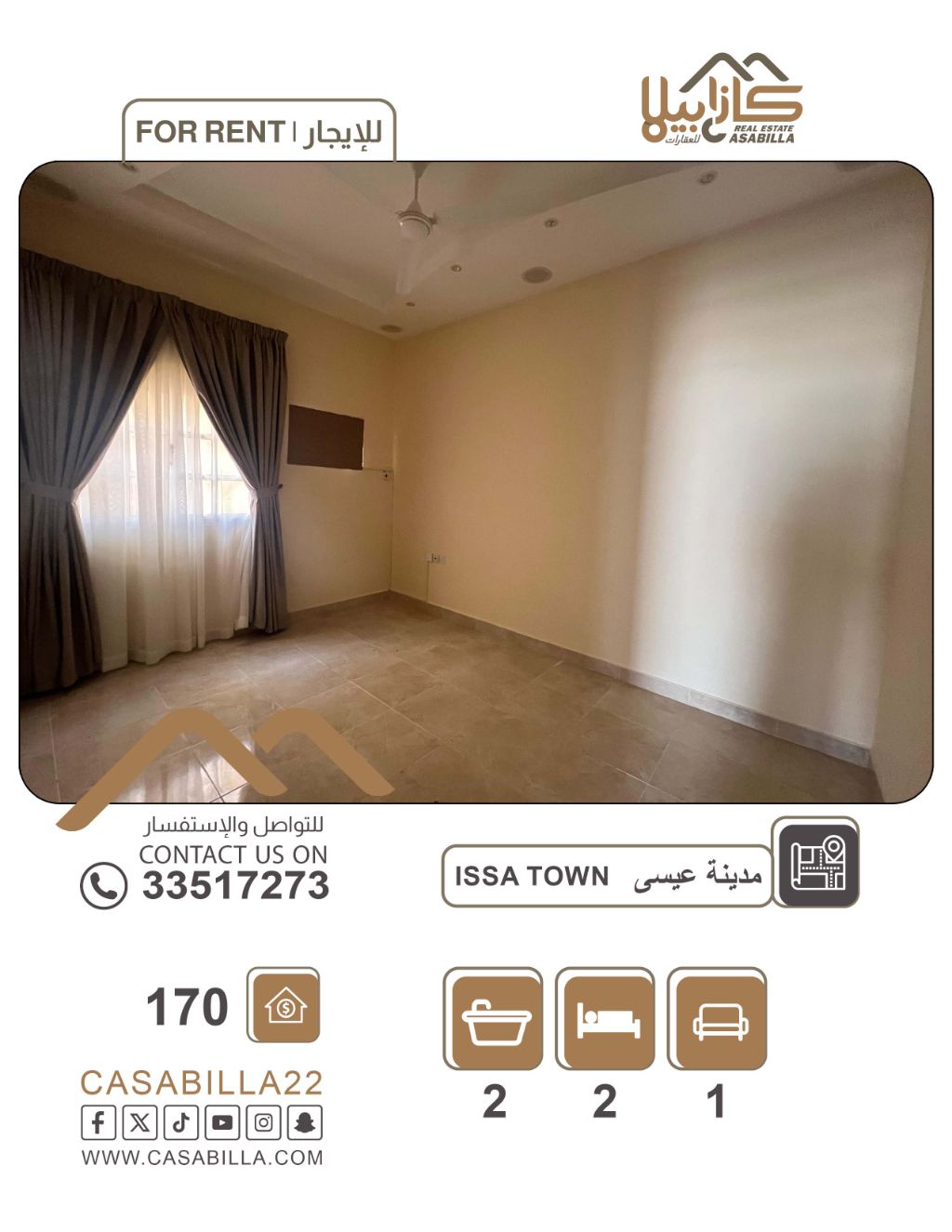 للإيجار: شقة نظيفة في مدينة عيسى، قريبة من دوار ديسكفري. تحتوي على غرفتين (واحدة ماستر)، حمامين، مطبخ، صالة، وبلكونة كبيرة. قريبة من الخدمات والمجمعات التجارية والمطاعم والمدارس والمسجد. الإيجار 170 دينار بحريني، غير شامل الكهرباء والماء. للتواصل.