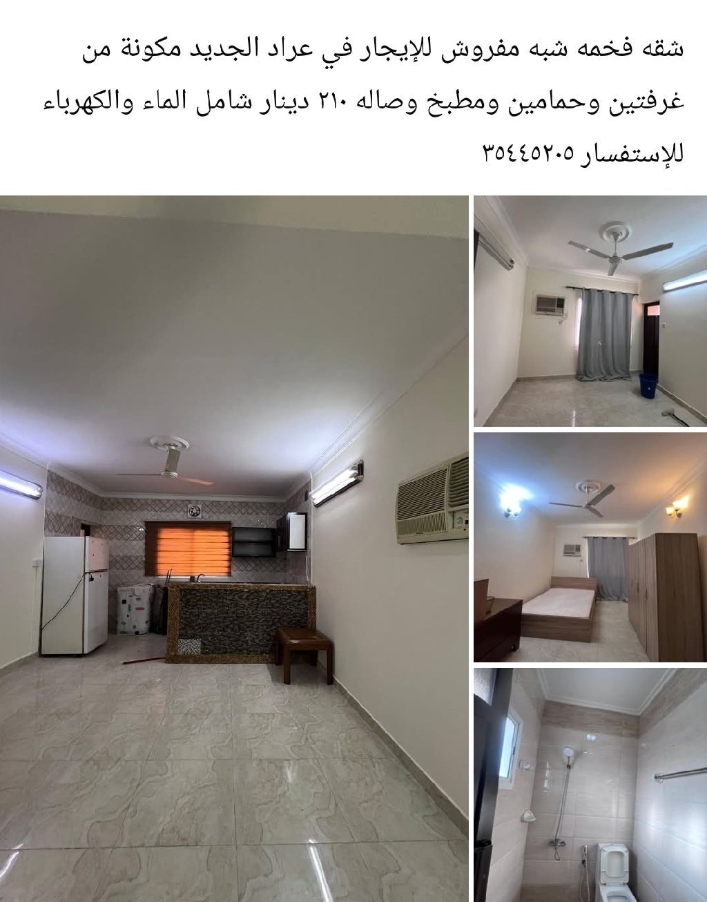 شقة فخمة شبه مفروشة للإيجار في عراد الجديد، مكونة من غرفتين وحمامين ومطبخ وصالة، بسعر 210 دينار شامل الماء والكهرباء.