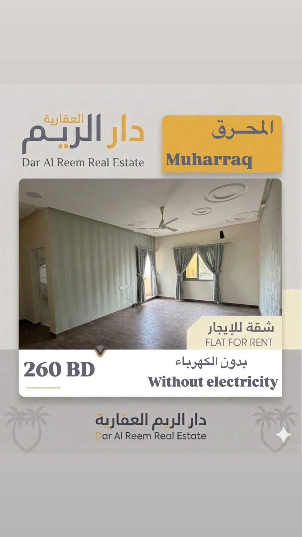 للإيجار: شقة راقية في منطقة المحرق، تتكون من 3 غرف، 2 حمامات، صالة، مطبخ، وبلكونة، في الطابق الأول. الإيجار 260 بدون الكهرباء. التواصل للمزيد من المعلومات.
