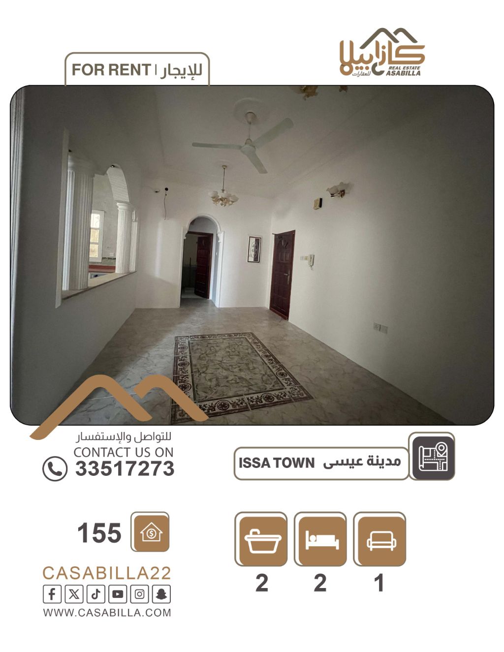 للإيجار شقة في مدينة عيسى. أولاً، تفاصيل الشقة: غرفتي نوم (واحدة ماستر)، حمامين، صالة عائلية واحدة، مطبخ مفتوح، بارك مظلل. ثانياً، المرافق والخدمات: حديقة قريبة من البناية، منطقة هادئة جداً، قريبة من الخدمات وشارع رئيسي. الإيجار 155 دينار بحريني، غير شامل الكهرباء والماء. للمزيد من المعلومات، الاتصال.