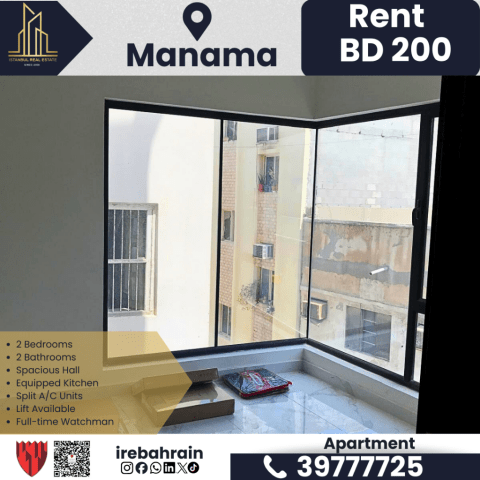 شقة نصف مفروشة بغرفتي نوم في المنامة - 200 دينار بحريني فقط. مركز المنامة خلف سنتر يتيم. شقة شبه مفروشة مبنية حديثا في موقع مركزي متميز. مميزات الشقة 2 غرف نوم، 2 حمام، صالة واسعة، مطبخ مجهز، وحدات تكييف سبليت، ستائر، اجهزة متضمنة (ثلاجة، غسالة، نطاق الطبخ والفرن متوفر) مصعد، حارس بدوام كامل، قريبة من مستشفى الإرسالية الأمريكية ومستشفى الشفاء وباب البحرين. الإيجار 200 دينار بحريني شهريا (بدون فواتير)