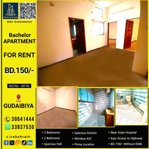 شقة عزاب بغرفتي نوم للإيجار في القضيبية بالقرب من مستشفى استر. هذه الشقة السكنية تقع في القضيبية بالقرب من مستشفى استر. تحتوي على غرفتي نوم واسعتين، حمامين، مطبخ، صالة واسعة، ونوافذ مكيفة. الإيجار هو 150 دينارا بحرينيا شهريا بدون رسوم الكهرباء والماء، مع سهولة الوصول الى العدلية والحورة والجفير والمنامة والسلمانية وأم الحصم وغيرها