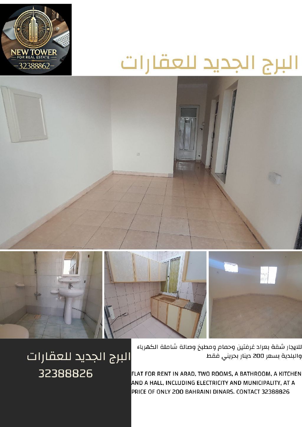 For rent: An apartment in Arad, with two bedrooms, a bathroom, a kitchen, and a living room. Includes electricity and municipality fees, priced at only 190 Bahraini dinars. For contact: Al Burj Al Jadeed Real Estate.