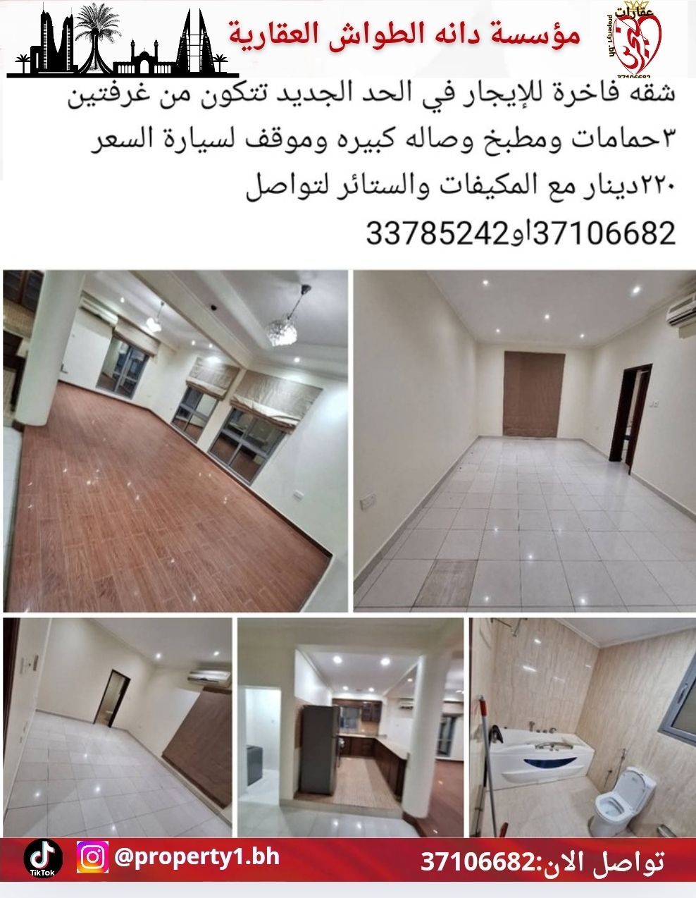 A luxurious apartment for rent in Al Hidd, consisting of two bedrooms, three bathrooms, a kitchen, a large living room, and a parking space. The price is 220 dinars with air conditioners and curtains. For contact.