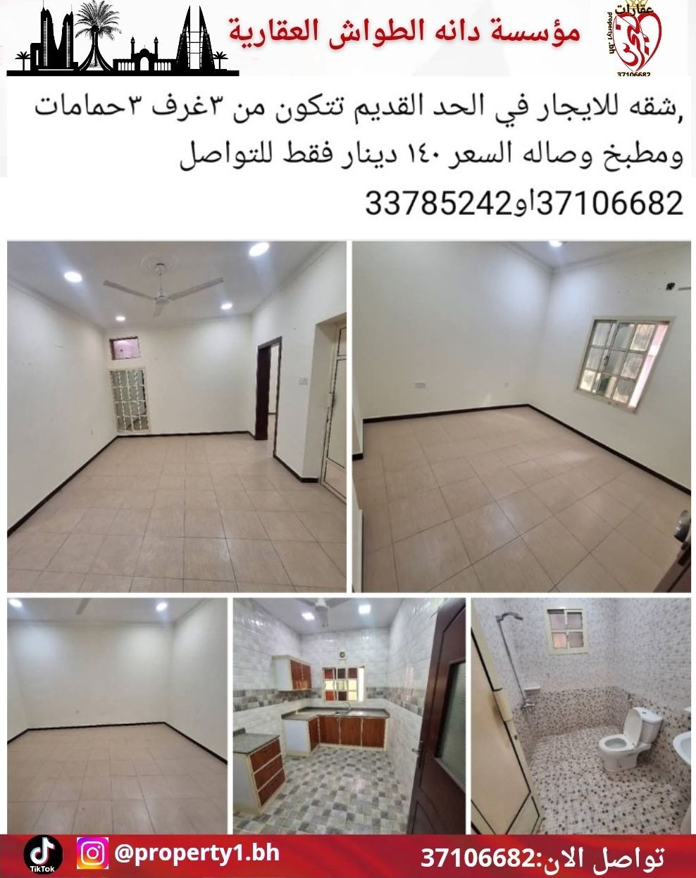 An apartment for rent in Al-Hadd Al-Qadeem, consisting of 3 rooms, 3 bathrooms, a kitchen, and a hall. The price is only 140 dinars. For contact.