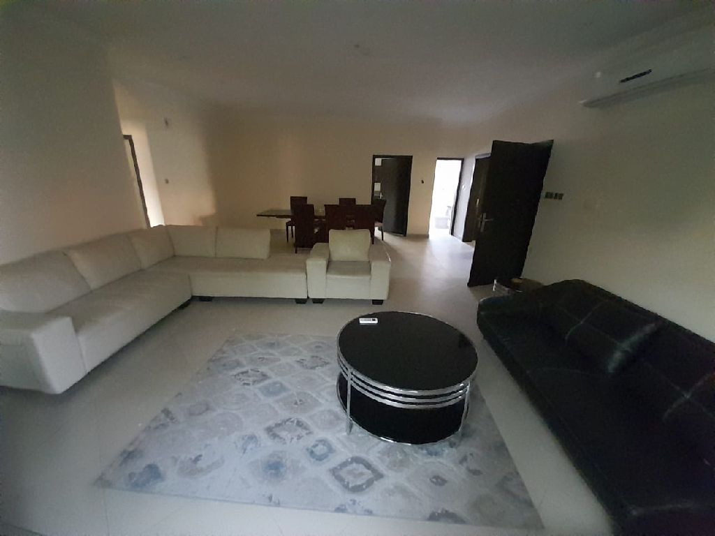 A luxurious apartment for rent, consisting of 3 rooms, 3 bathrooms, a large living room, a kitchen, a laundry room, a swimming pool, a parking space, and an elevator. The rent is 300 dinars. For contact, Al Burj Al Jadeed Real Estate.