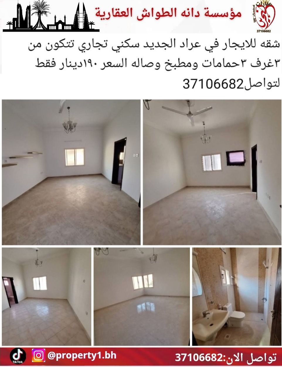 Apartment for rent in New Arad, residential-commercial, consisting of 3 rooms, 3 bathrooms, a kitchen, and a hall. Price is only 170 dinars for contact.