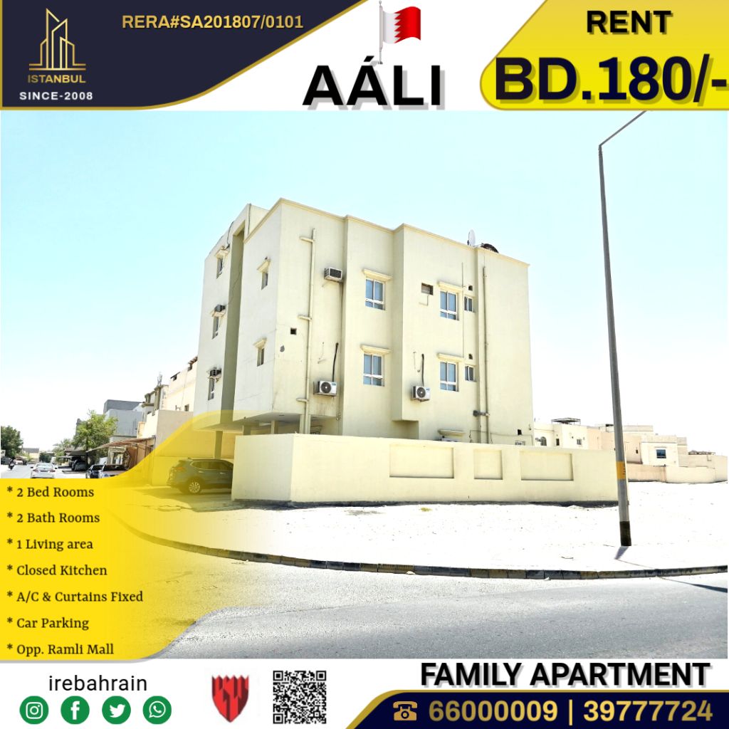 Family Apartment for rent in A'Ali, Opp. Ramli Mall, BD180. This residential apartment is located in A'Ali, in a very good location. It consists of 2 spacious bedrooms, 2 bathrooms, a closed kitchen, and a living area. There is AC and curtains in all rooms and the hall. Parking facility, close to Ramli Mall, Lulu, AMH, Driving School, etc. rent is BD180 without EWA