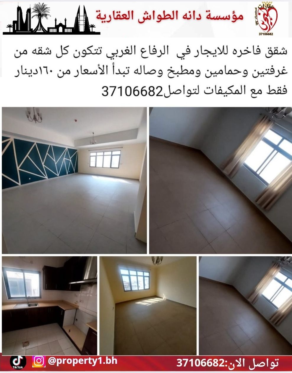 Luxury apartments for rent in West Riffa. Each apartment consists of two bedrooms, two bathrooms, a kitchen, and a living room. Prices start from just 160 dinars with air conditioning. For contact.
