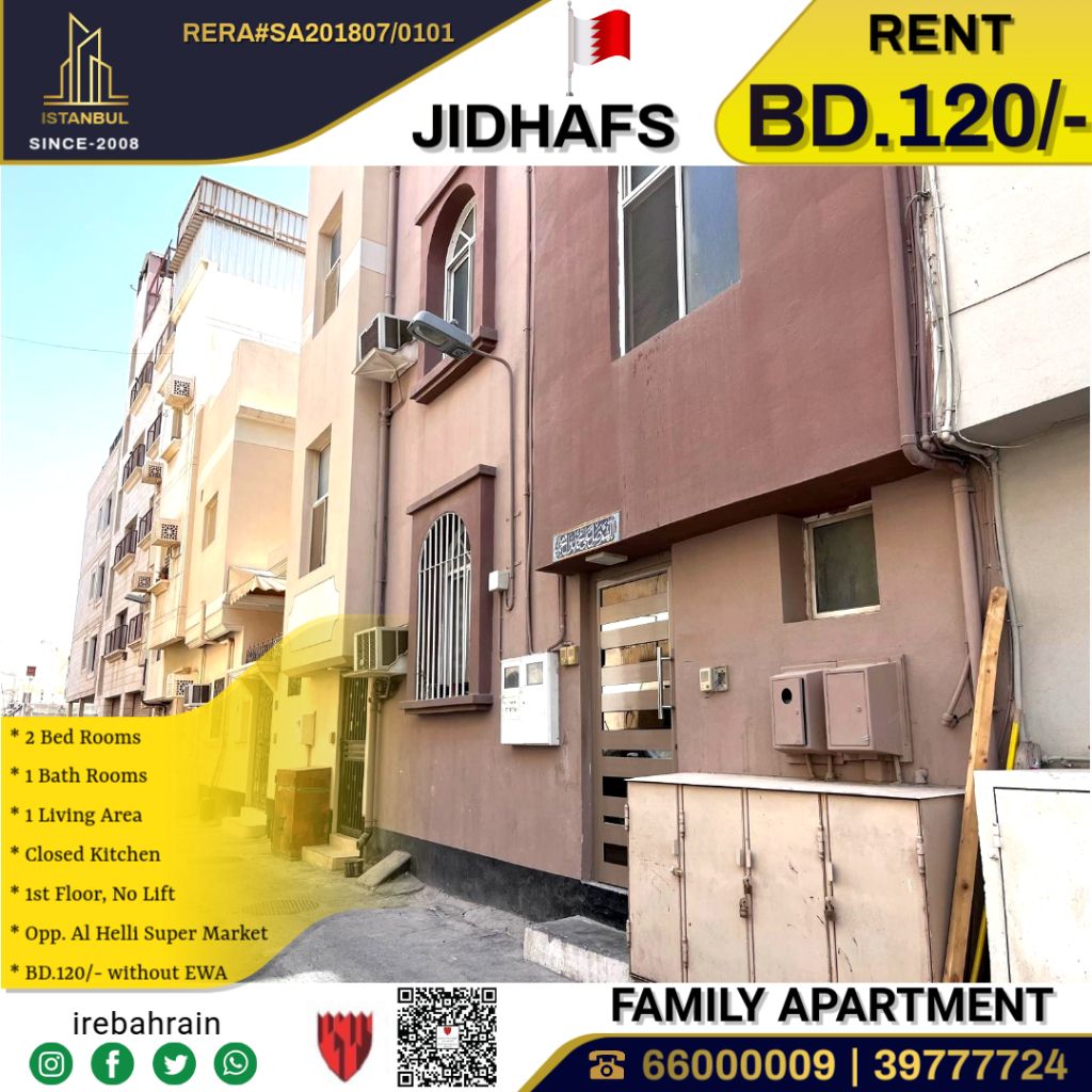 Family Apartment for rent in Jidhafs for BD120. This apartment consists of 2 bedrooms, 1 bathroom, 1 closed kitchen, 1 living area, etc. It is located in Jidhafs, opposite Al Helli supermarket. The rent is BD120 only without EWA. easy access to Budaiya, Manama, Seef, Sanabis, Salmabad, Tubli, etc