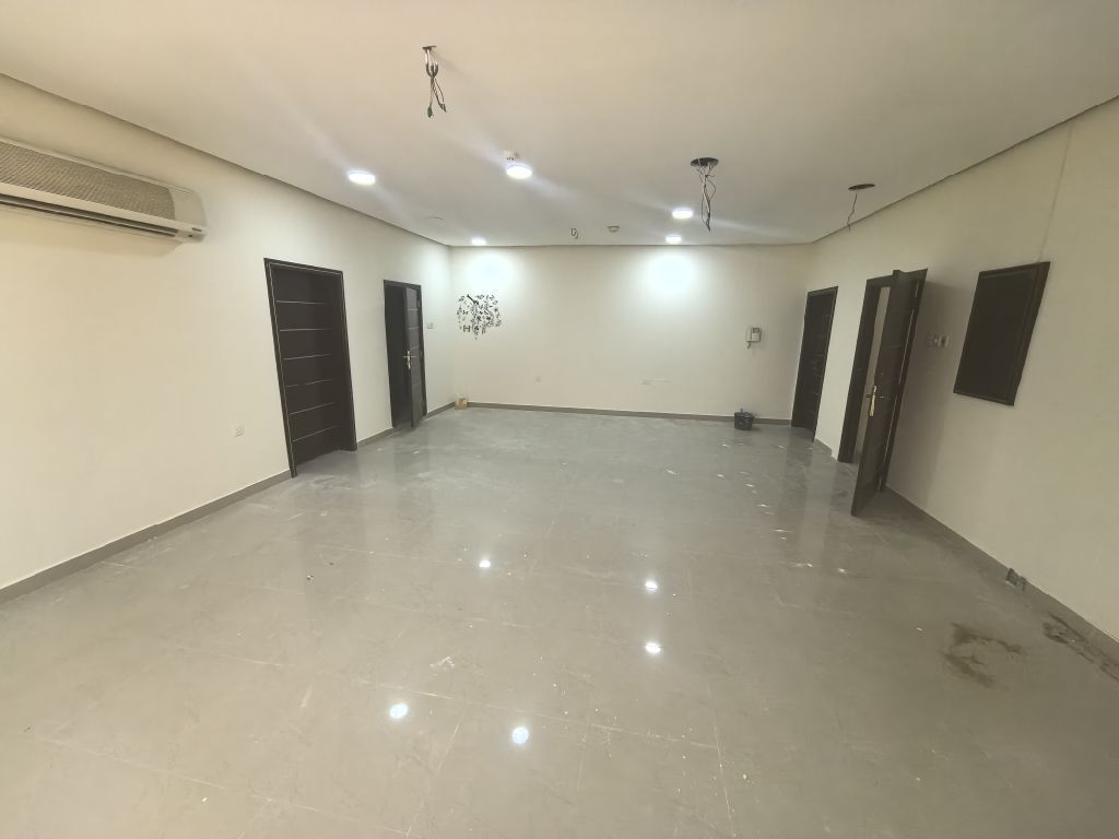 A residential apartment for rent, including water and electricity. It is on the ground floor and consists of two rooms, a large hall, an open kitchen, and three bathrooms. The price is 230 dinars, with a service fee of 30 dinars. Parking is available. The location is in Hidd Al - Jadeed, near Aseel markets