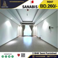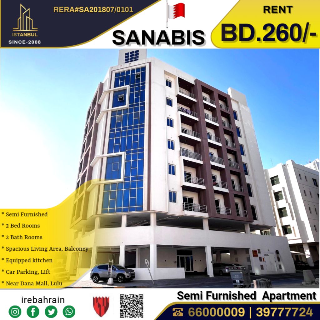 Modern 2 - bedroom luxury apartment for rent in Sanabis - BD260 only. Live in style near Dana Mall in this semi furnished, contemporary 2 - bedroom apartment featuring 2 elegant bathrooms, a spacious living area with balcony, fully equipped closed kitchen, central AC, elevator access, dedicated car parking, and 24 - hour security. Perfectly located with easy access to Lulu, Seef, City Centre, Financial