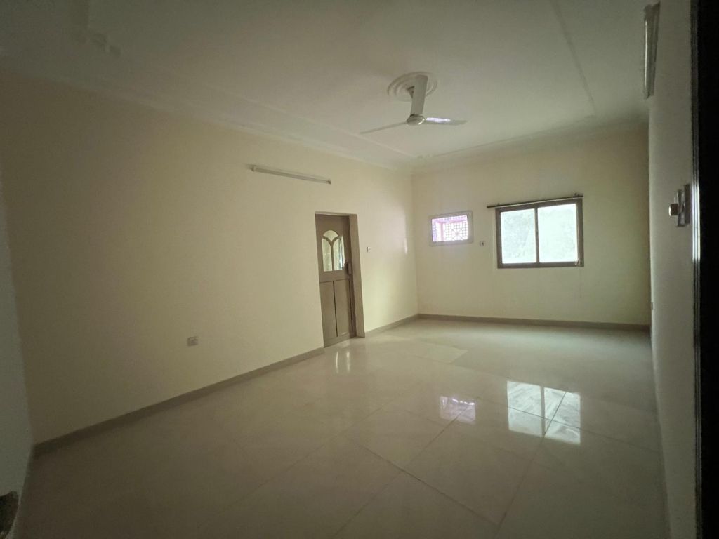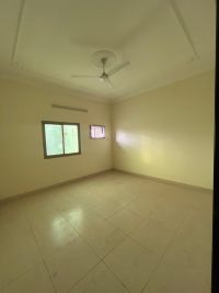 For rent, an apartment in Sanad consisting of 3 rooms, a hall, a kitchen, and two bathrooms, on the second floor with a staircase and private parking. The price is 220 dinars, excluding electricity, with air conditioners.