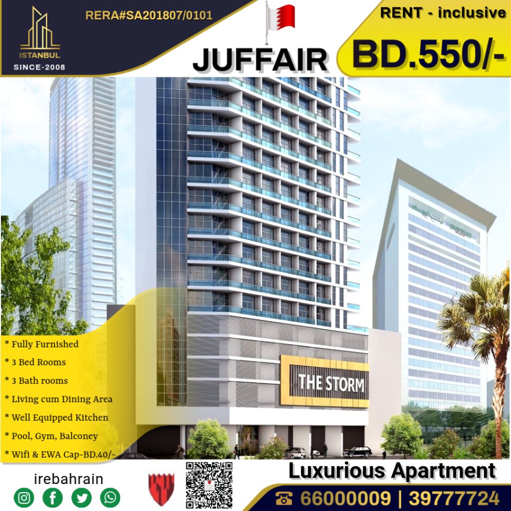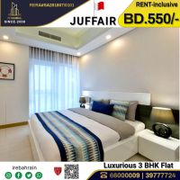 Fully furnished luxurious 3 BHK Apartment in Juffair BD550/ inclusive. This luxurious apartment is located in the prime location of Bahrain where most expats live. It is fully furnished with high - end furniture, featuring 3 bedrooms, 3 bathrooms, a spacious living cum dining area, well - equipped kitchen, balcony, car parking, 24 - hour reception & maintenance, swimming pool, gym, sauna, etc. We