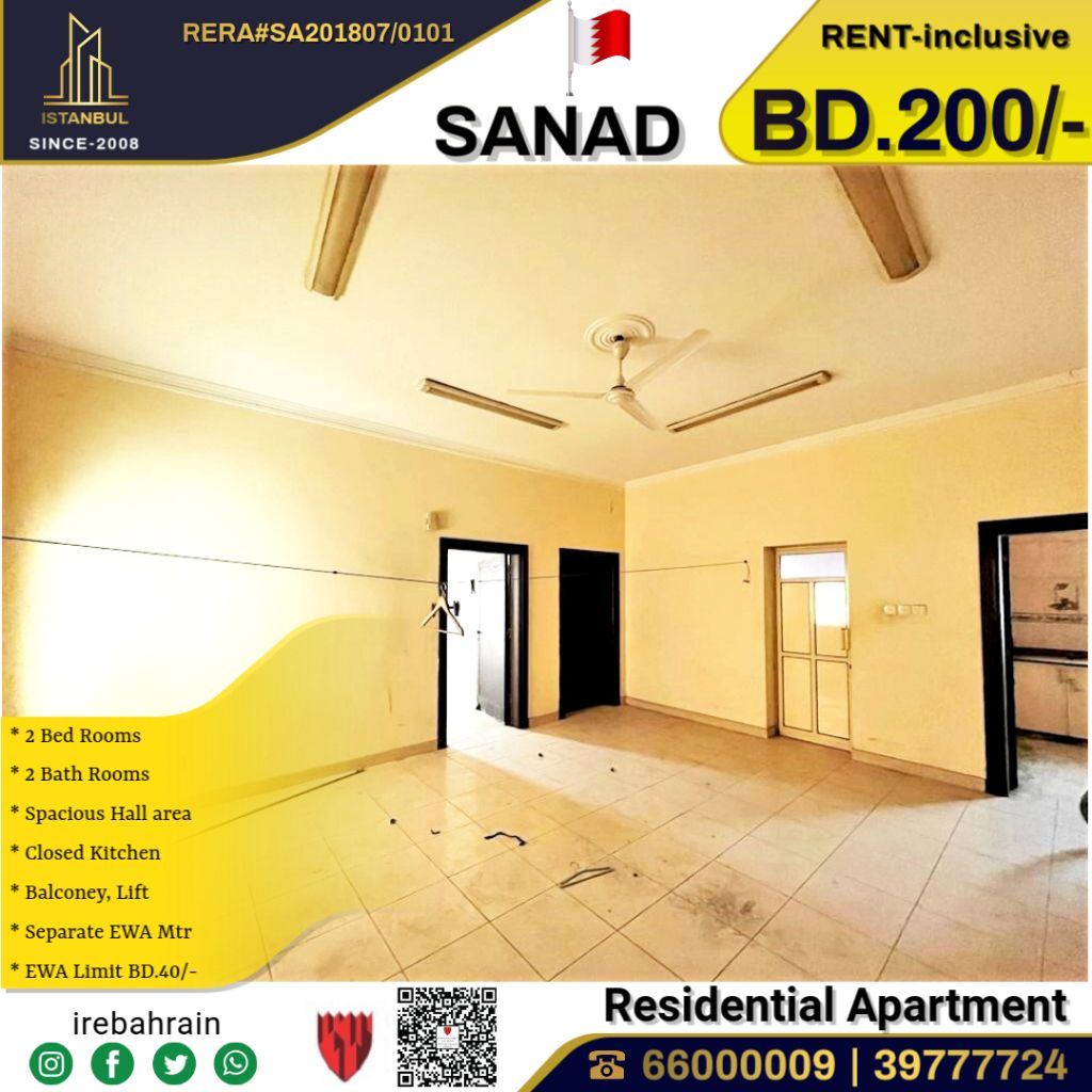 Residential flat for rent in Sanad, behind Bahrain Pride, for BD200/ including EWA. This is a very good apartment, having 2 bedrooms, 2 bathrooms, spacious hall, kitchen, car parking, lift, easy access to Riffa, Sitra, ALBA, Salmabad, etc. rent is BD200/ per month including EWA (CAP - BD40)