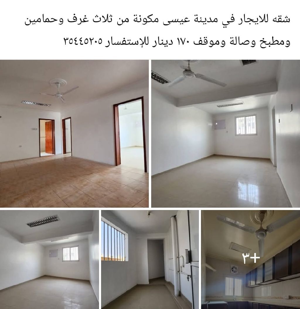 An apartment for rent in Isa Town, consisting of three rooms, two bathrooms, a kitchen, a hall, and a parking space, for 170 dinars.