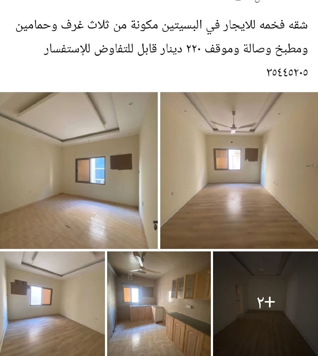 A luxurious apartment for rent in Al-Busaiteen, consisting of three rooms, two bathrooms, a kitchen, a living room, and a parking space. The price is 220 dinars, negotiable.