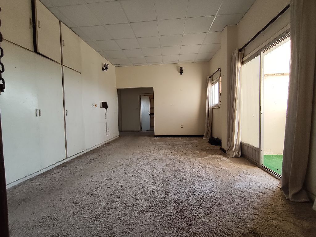 Spacious 3BHK unfurnished flat for rent on Khamis Highway. BD200 per month without EWA. 3 - phase electricity. Includes a hall, 3 bedrooms, 2 bathrooms, a closed kitchen, and 3 balconies. Rooms have built - in cabinets. Elevator and car parking available. Reference number K180901. Contact for details