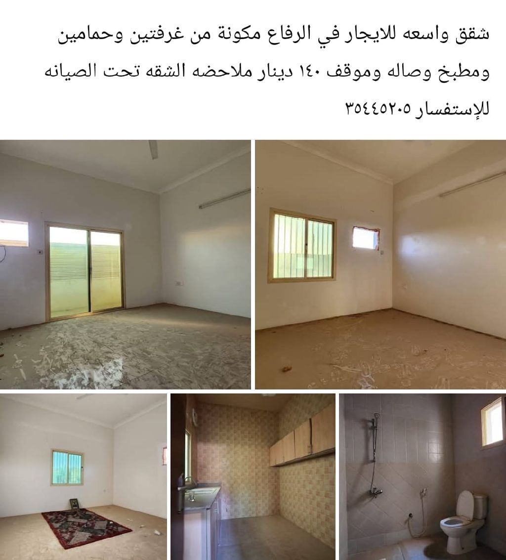 A spacious apartment for rent in Riffa, consisting of two bedrooms, two bathrooms, a kitchen, a living room, and a parking space for 140 dinars.