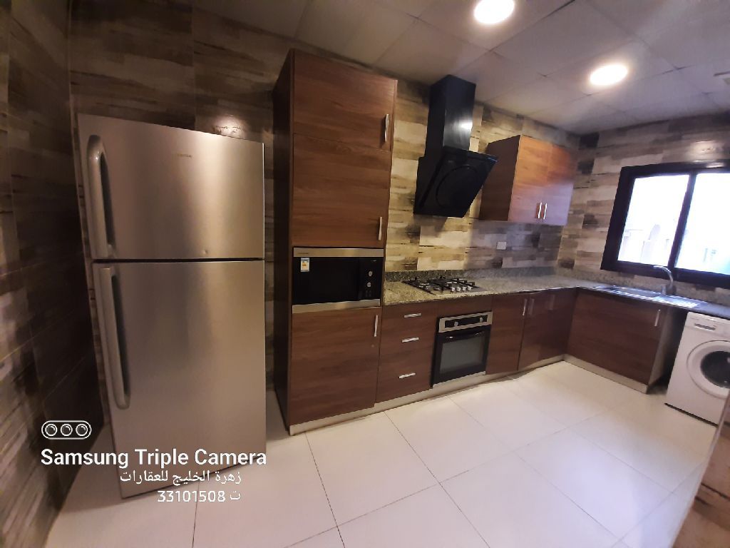 A semi furnished apartment for rent in Sanad, clean, 2 bedrooms, 2 bathrooms, living room, spacious kitchen, elevator, parking, air conditioners, refrigerator, oven, washing machine. Price 280 dinars including electricity