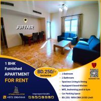 A furnished one - bedroom apartment for rent in Juffair for 250 Bahraini dinars, including electricity and water (EWA) This apartment is located in Juffair near Oasis Mall. It consists of one bedroom, one bathroom, a spacious living and dining area, fully equipped kitchen, WiFi - service, a swimming pool, a gym, covered parking, and 24 - hour security. easy access to Juffair Mall, Oasis Mall, Adliya