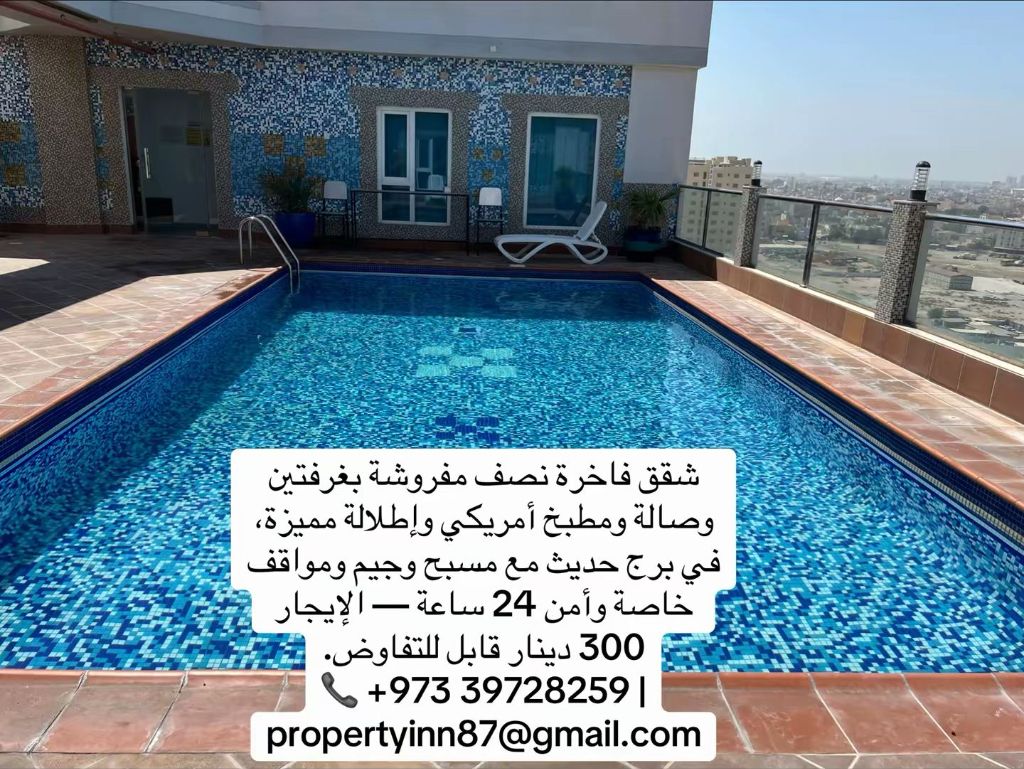 For rent - Modern & Spacious Apartments in Sanabis. Prime location near top shopping malls such as Bahrain Mall and Dana Mall. The apartment features 2 bedrooms, a spacious living room, an open American-style kitchen, a balcony, 2 bathrooms, semi-furnished, and equipped with AC units. Free access to swimming pool, fully equipped gym, BBQ area, and indoor parking. Many additional facilities. Rent: 300 BD (Negotiable).