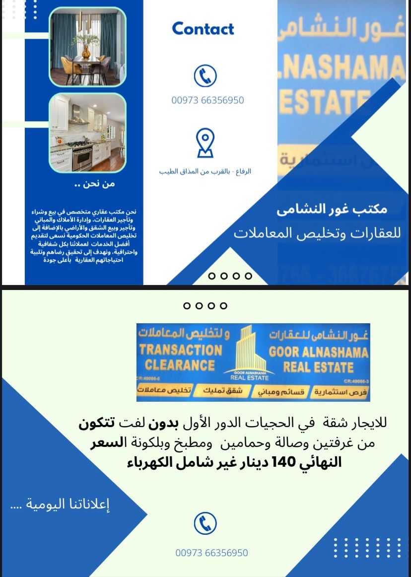 For rent: An apartment in Al-Hajiyat, Riffa, first floor, consisting of two rooms, a living room, two bathrooms, a kitchen, and a balcony. Final price is 140 dinars, excluding electricity. For inquiries, call the number.