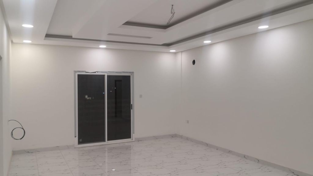 For rent: An apartment in Riffa Al Hajiyat with 4 bedrooms, 4 bathrooms, a living room, kitchen, balcony, and two car parking spaces. The apartment is very clean and elegant, in a prime location. Rent is 350 BHD including electricity. For contact.
