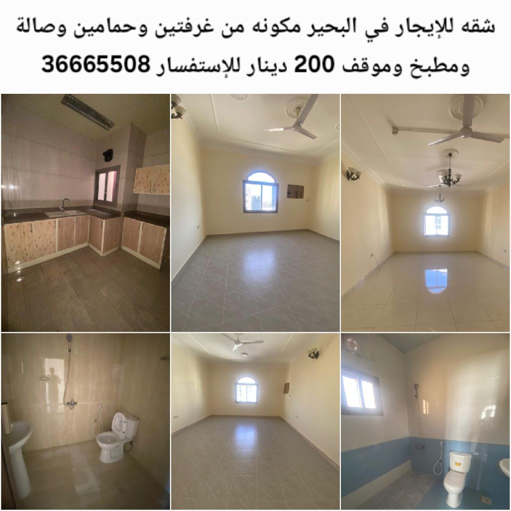 An apartment for rent in Al-Bahair, consisting of two rooms, two bathrooms, a hall, a kitchen, and a parking space for 200 dinars. For inquiries.