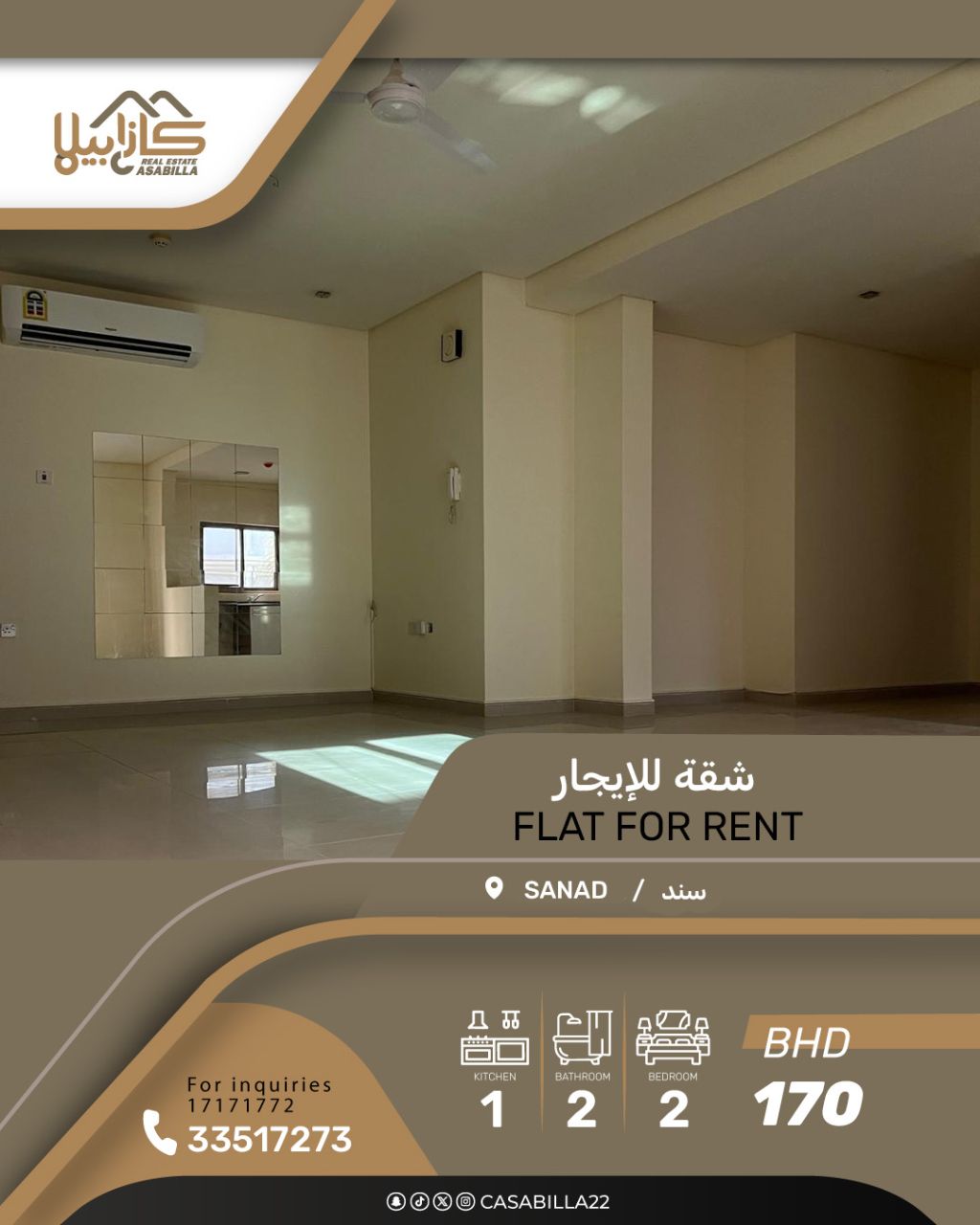 Apartment for rent in Sanad, behind the jewelry markets, close to services. Two bedrooms, two bathrooms, spacious living room, kitchen. Services and facilities, parking space, very quiet area. Rent is 170 without electricity. For contact.