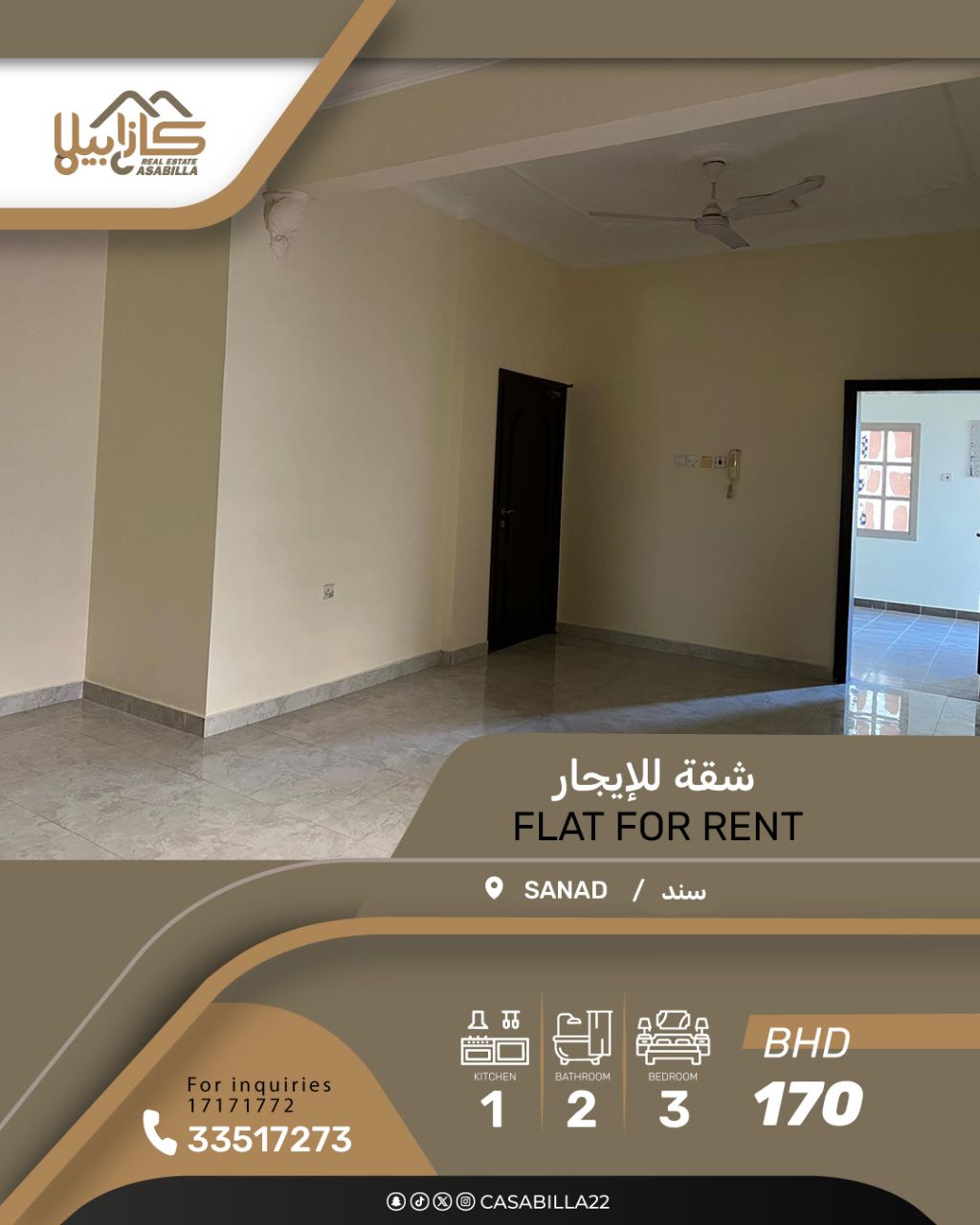Apartment for rent in Sanad, behind the jewelry markets, close to services. Three bedrooms, two bathrooms, spacious living room, kitchen, services and facilities, parking in a very quiet area. Rent is 170 without electricity. To contact.