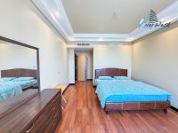 Bright interiors with beautiful east city views in Abraj for rent at BD400 (Exclusive). Property features include 2 bedrooms with en-suite bathrooms, a guest toilet, a bright living and dining area, a semi-open kitchen with a dishwasher, modern furnishings and quality fittings, and an east-facing orientation with a city view. Building facilities include a shared swimming pool and gym, a kids' play area, a basketball court, a basement supermarket, and 24/7 services.