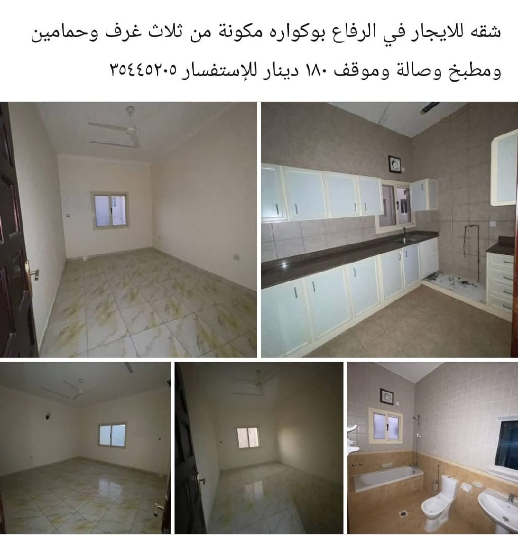 Apartment for rent in Riffa Abu Quwara, consisting of three rooms, two bathrooms, a kitchen, a living room, and a parking space, for 180 dinars.
