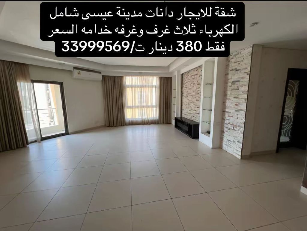 For rent: A Dana apartment in Isa Town, including electricity and water. It consists of three bedrooms, three bathrooms, a large living room, a maid's room with a bathroom, a large balcony, a kitchen, a private shaded parking space, and an elevator. The price is 380 dinars, including electricity. Contact for more information.