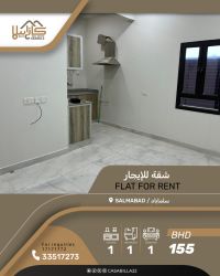 For rent: An apartment in Salmabad, close to Dana Al Tawfeer markets. It has one bedroom, one bathroom, a living room with a kitchen, and a shaded garage. The building is new and includes electricity and water. The rent is 155 dinars. Indian families are preferred. For contact.
