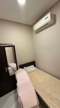 A luxurious furnished apartment for rent in the Al-Hidd area, consisting of three bedrooms, three bathrooms, a kitchen, a spacious living room with a balcony and sea view, a maid's room with a bathroom, an elevator, and private parking for two cars. The price is 300 dinars, excluding electricity. Contact for more information.