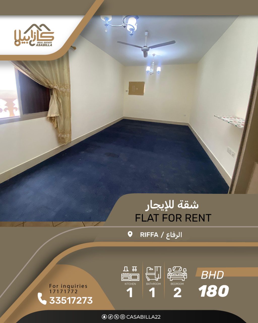Apartment for rent in Riffa, near Al-Jazri Mosque, close to services. Two bedrooms, bathroom, living room, kitchen. Services and facilities, car parking, quiet area, private entrance, and large private roof. Rent is 180 BHD including electricity and water. For contact.