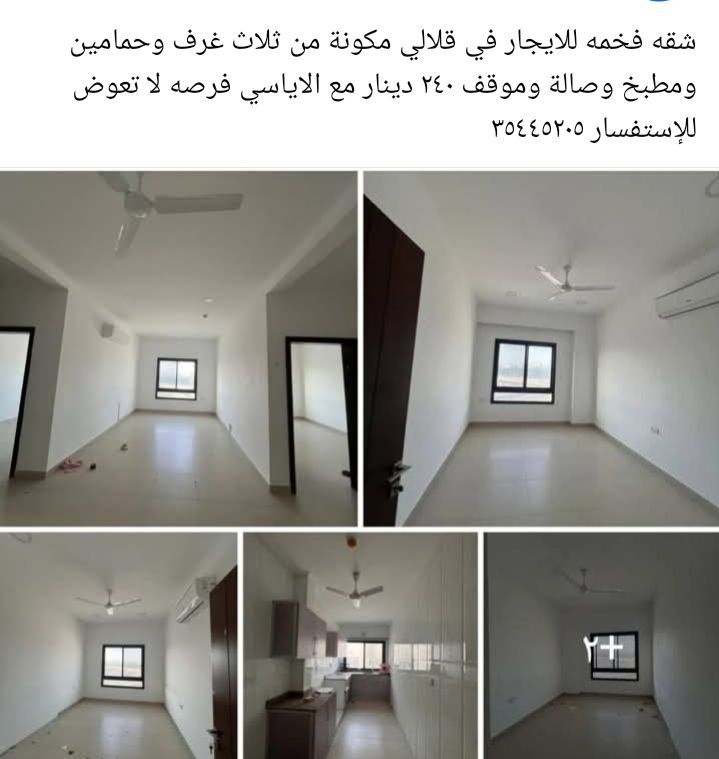 A luxurious apartment for rent in a commercial-residential building in Qalali, consisting of three rooms, two bathrooms, a kitchen, and a hall, priced at 240 dinars with air conditioning. An unmissable opportunity.
