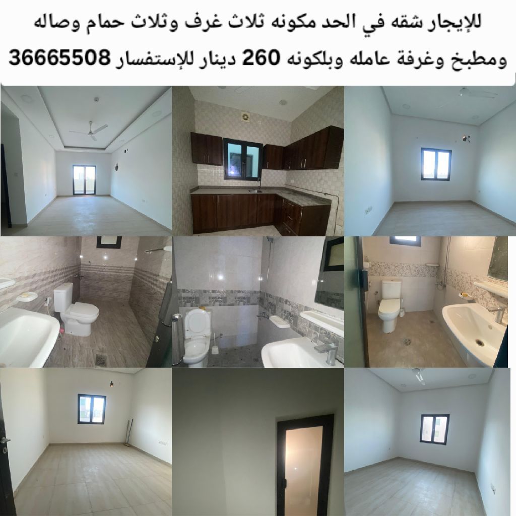 For rent, an apartment in Al Hidd consisting of three rooms, three bathrooms, a hall, a kitchen, a maid's room, and a balcony for 260 dinars. For inquiries.
