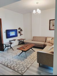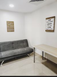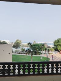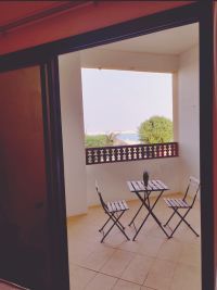 Apartment for rent in Amwaj with a sea view, featuring a master bedroom, a small room for a child, two bathrooms, and a kitchen. The required rent is 350 dinars, including electricity and a 20 dinar internet fee. Please contact for more information.