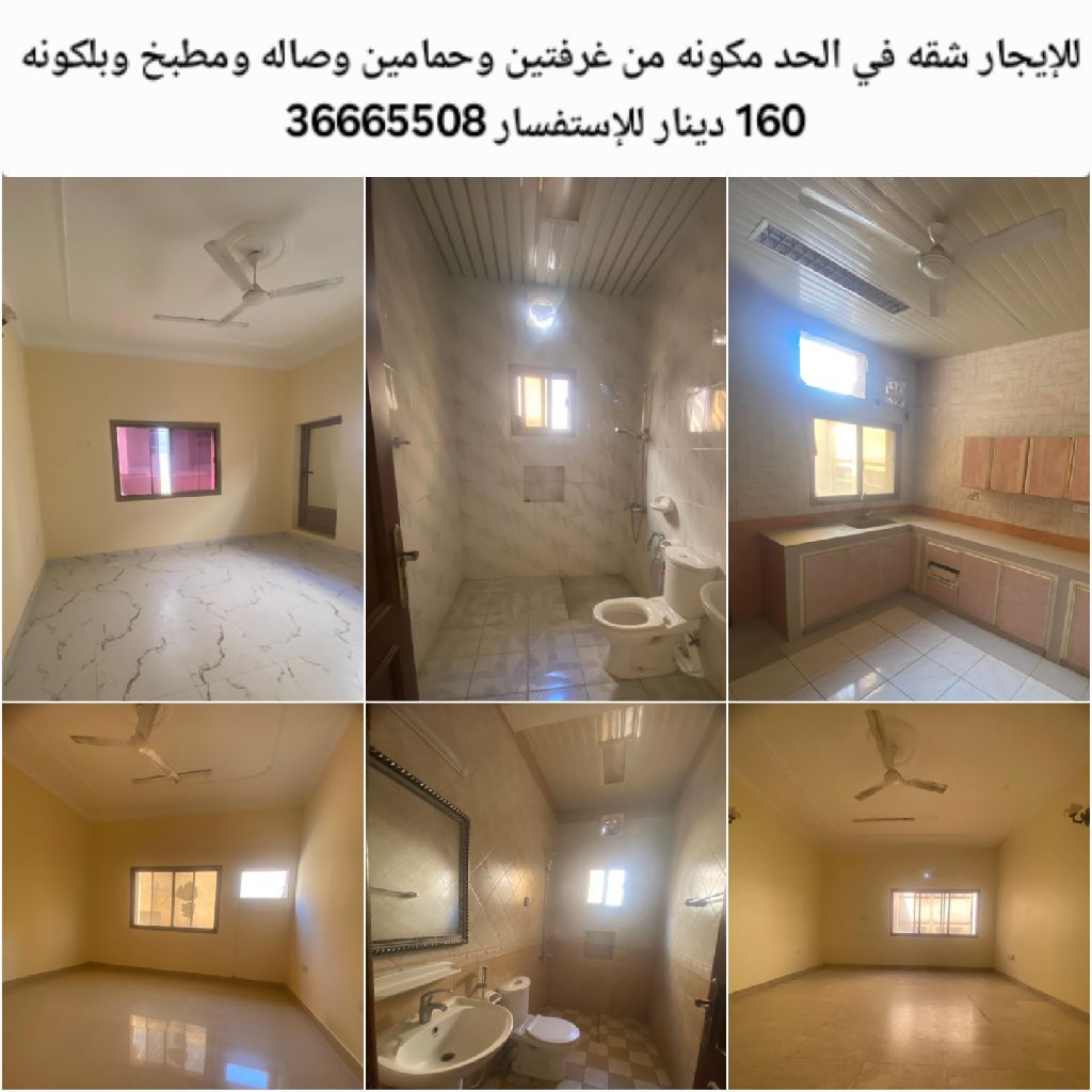 For rent, an apartment in Hidd consisting of two rooms, two bathrooms, a hall, a kitchen, and a balcony for 160 dinars