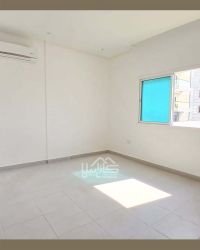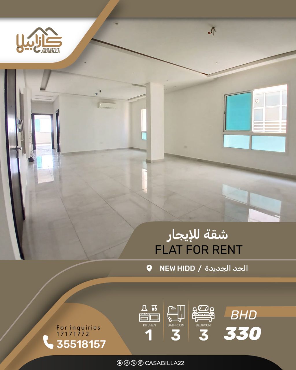 For rent: An elegant and spacious apartment in the New Hidd area, consisting of 3 bedrooms, 3 bathrooms, a large family living room, a kitchen with a storage balcony, equipped with air conditioners and a gas oven. There is an elevator and a private parking space. The price is 330 dinars, excluding electricity. For inquiries.