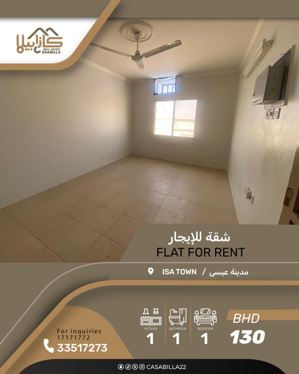 For rent: A studio in Isa Town, near the health center and government schools. It consists of one bedroom, a bathroom, a kitchen, and a private roof. The price is 130 dinars, including electricity and water. For inquiries, call 30 dinars.