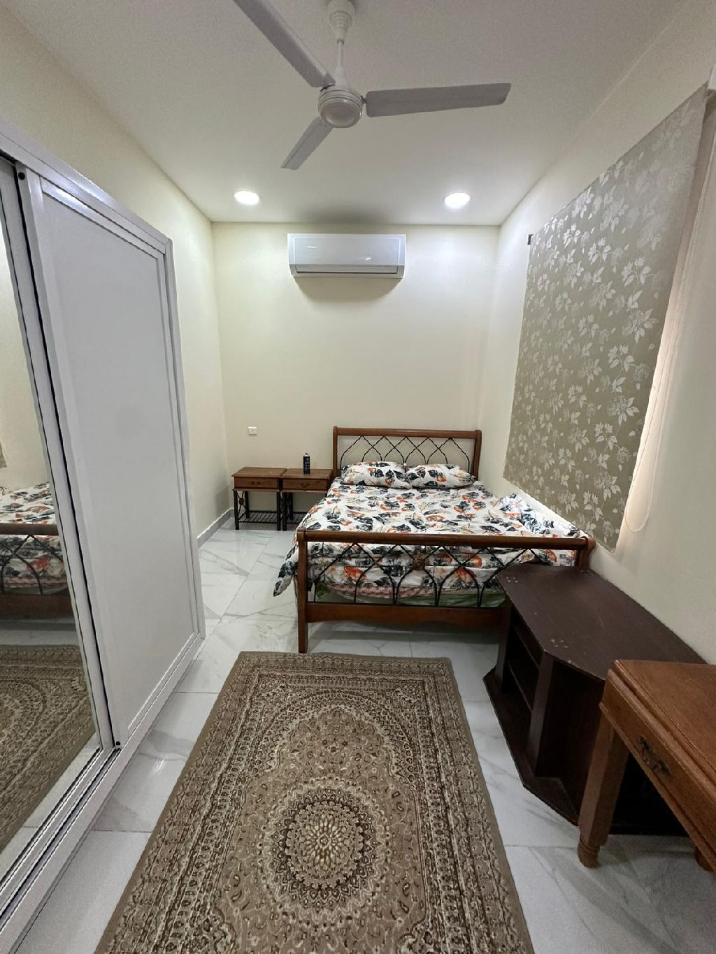For rent, a furnished apartment in Riffa Al Hajiyat, near Ibn Al Jazari Mosque, consisting of one bedroom, a living room, a bathroom, and a kitchen. The requested price is 180 dinars, including electricity and water. Contact number: 20.