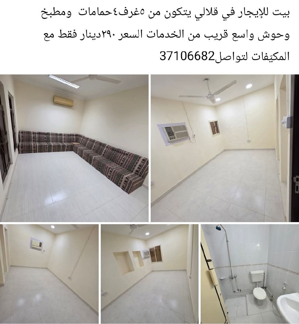 A house for rent in Qalali consisting of 5 rooms, 4 bathrooms, a kitchen, and a spacious yard. It is close to services. The price is only 290 dinars with air conditioners. For contact.
