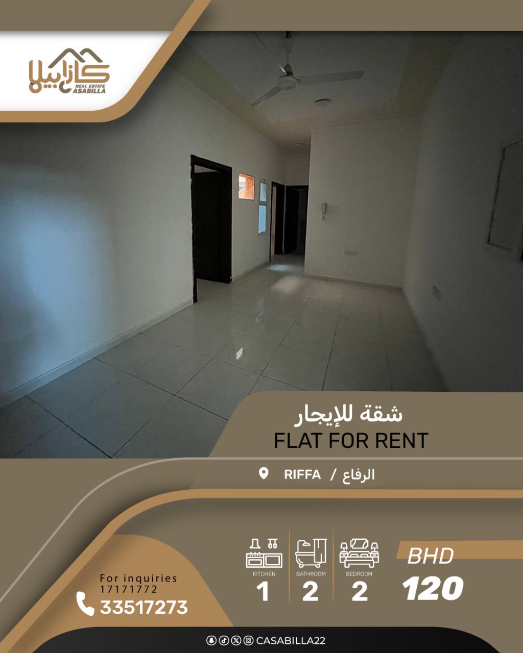 For rent: An apartment in Riffa. First, apartment details: one bedroom, one master bathroom, one family living room, one kitchen. Second, facilities: close to services and Riffa market, near Al Manar Library. Rent is 120 without electricity and water. For more information, please contact.
