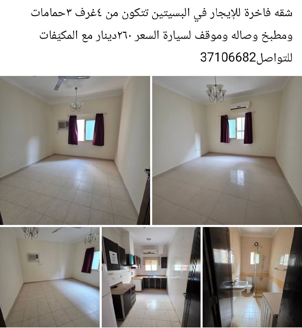 A luxurious apartment for rent in Al-Busaiteen, consisting of 4 rooms, 3 bathrooms, a kitchen, a living room, and a parking space. The price is 260 dinars with air conditioners. For contact.