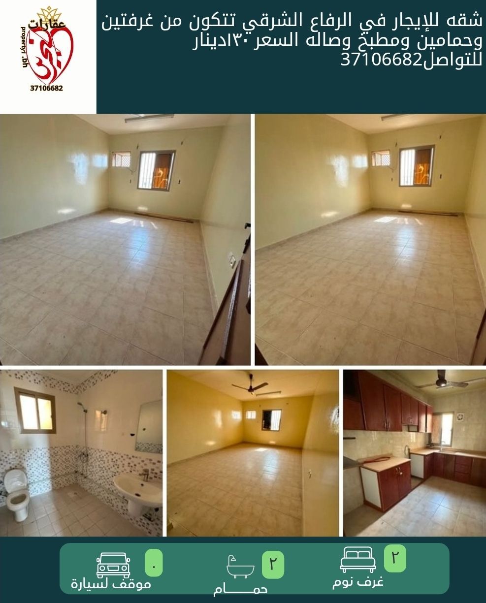 An apartment for rent in East Riffa consisting of two bedrooms, two bathrooms, a kitchen, and a living room. The price is 130 dinars. For contact.