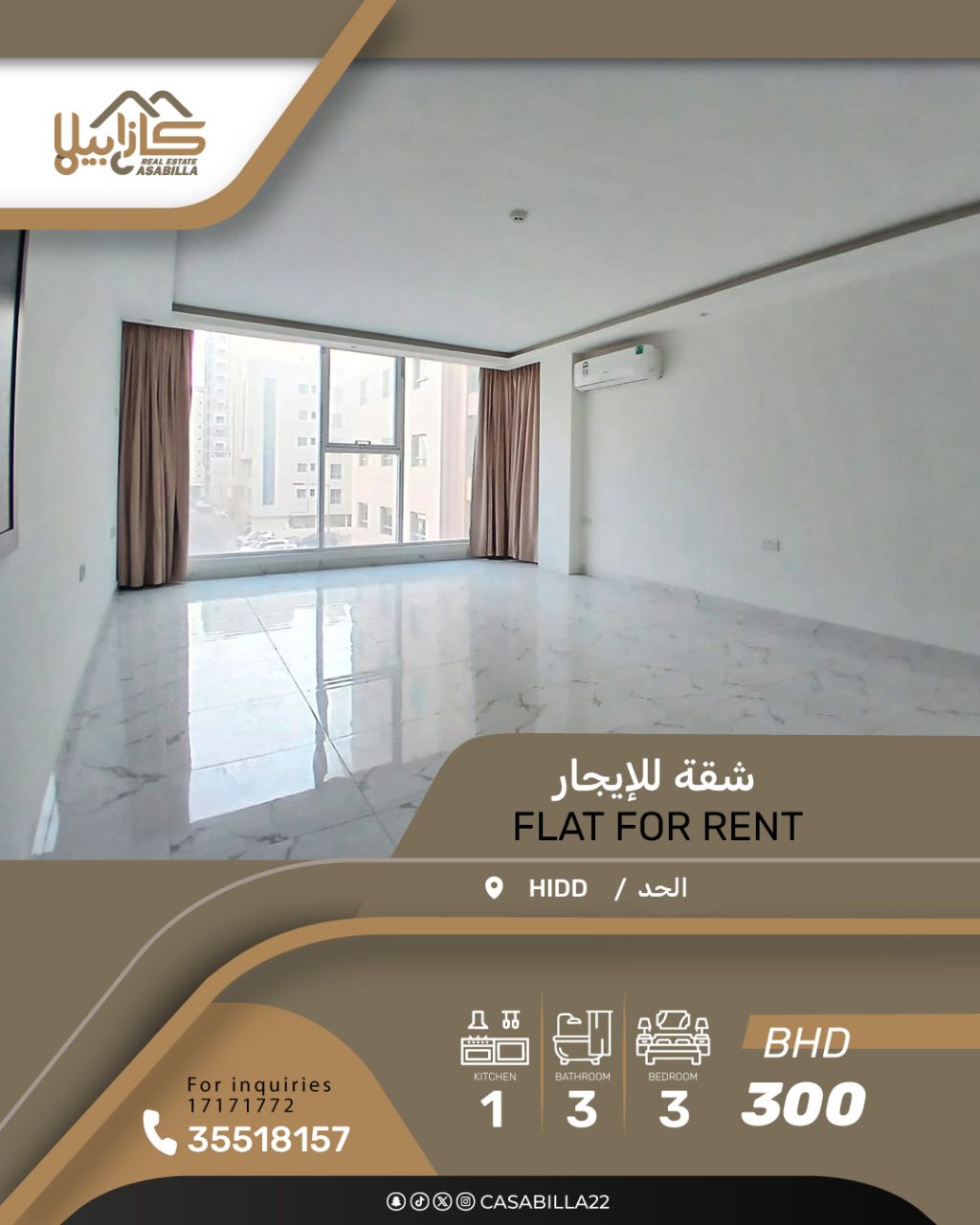 For rent: An elegant apartment in the New Hidd area, consisting of three bedrooms, a spacious family living room, a closed kitchen, three bathrooms, with air conditioners, curtains, and a washing machine. The price is 300 dinars, excluding electricity. For inquiries.