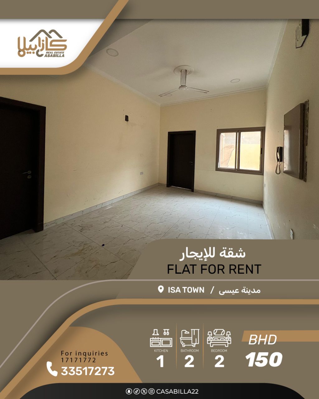 For rent: An apartment in Isa City, behind Al-Farooq Kindergarten. It has 2 rooms, one master bedroom, a living room, two bathrooms, and a shaded parking space. The area is quiet and close to services, shopping malls, restaurants, and schools. The rent is 150 BHD, excluding water and electricity. For contact.